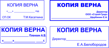 Штампы "копия верна"Используются для заверения копий документов. Могут быть как с местом для подписи, так и без. |